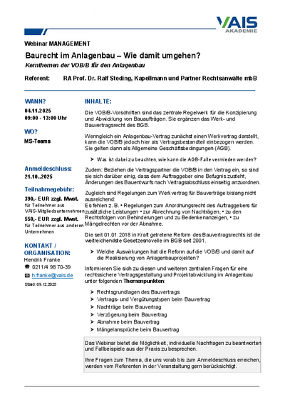 Das Webinar gibt Antworten zu diesen und weiteren zentralen Fragen für Vertragsgestaltung und Projektabwicklung und bietet die Möglichkeit, Fallbeispiele aus der Praxis zu besprechen. Fragen dazu, die uns vorab bis zum Anmeldeschluss erreichen, werden vom Referenten in der Veranstaltung gern berücksichtigt.