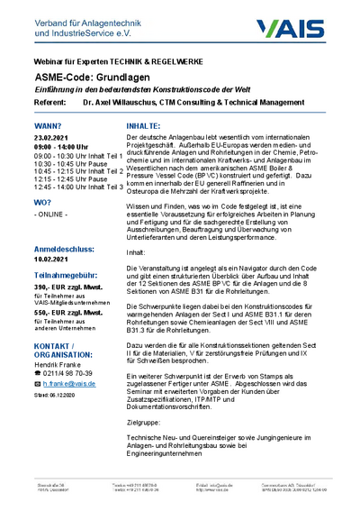 Die Veranstaltung gibt einen Überblick über Aufbau und Inhalt der 12 Sektionen des ASME BPVC für die Anlagen und die 8 Sektionen von ASME B31 für Rohrleitungen. Dazu werden die für alle Konstruktionssektionen geltenden Sect II für Materialien, V für zerstörungsfreie Prüfungen und IX für Schweißen besprochen.
