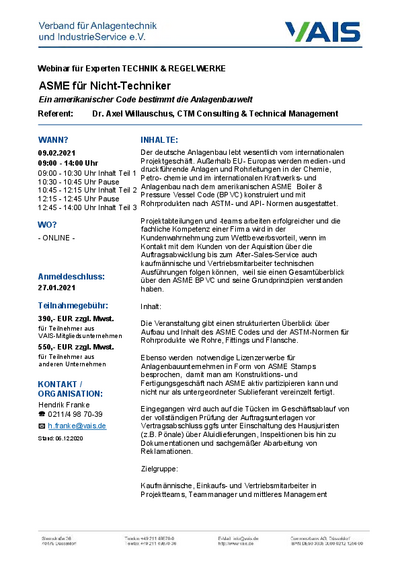 Die Veranstaltung gibt daher Nicht-Technikern einen Überblick über Aufbau und Inhalt des ASME Codes und der ASTM-Normen für Rohrprodukte. Lizenzerwerbe für Anlagenbauunternehmen ("ASME Stamps") werden ebenso besprochen, um aktiv am Konstruktions- und Fertigungsgeschäft nach ASME partizipieren zu können.